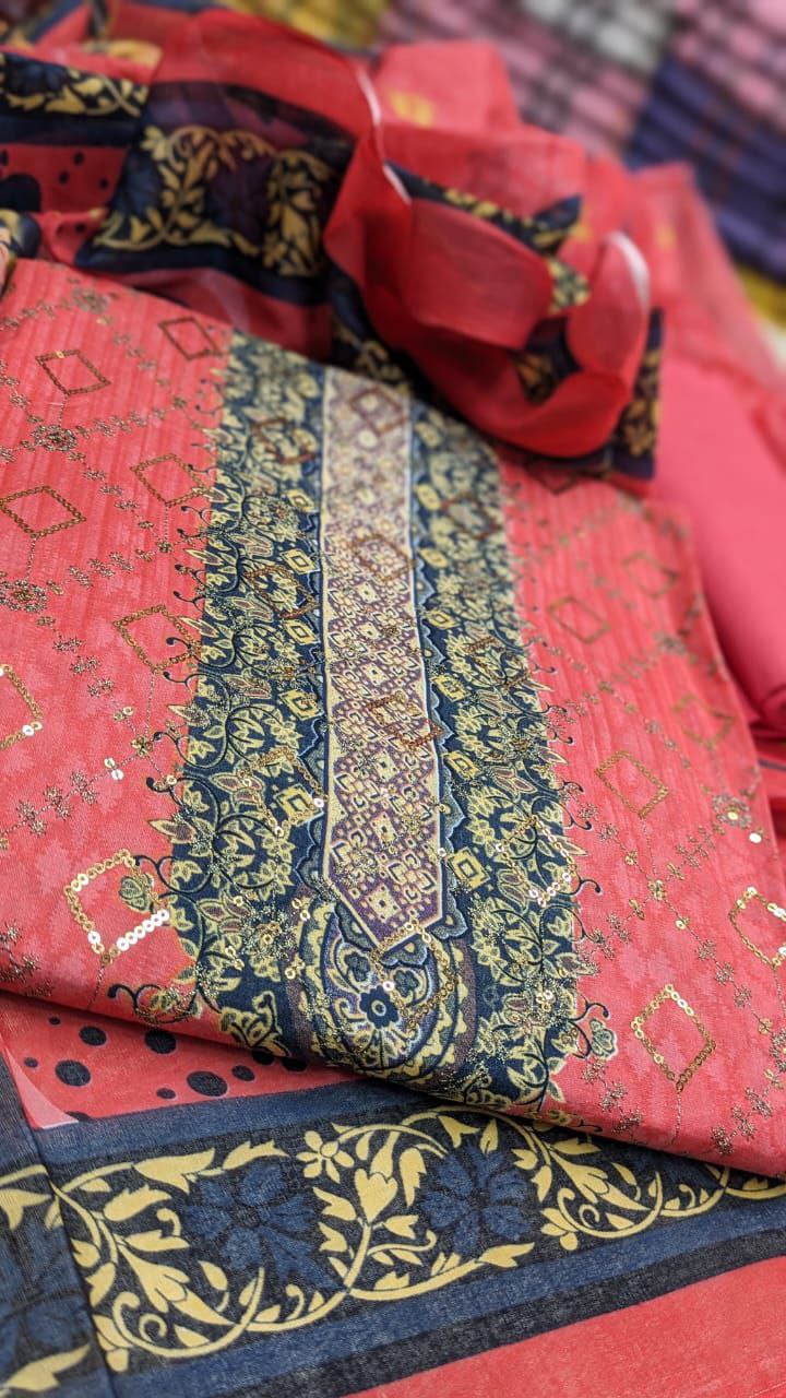 ★ প্রিমিয়াম কোয়ালিটি সুতি কাপড়ের উপর কম্পিউটার এমব্রয়ডারি এবং সিকুয়েন্স কাজ করা থ্রী পিস