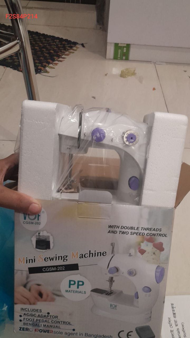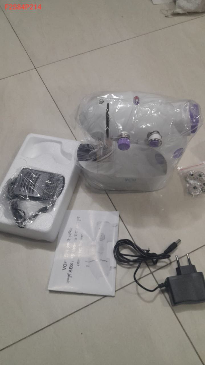 Portable mini 4-in-1 sewing machine has per-threaded and ready to use, handheld / desktop sewing machine, lightweight and portable, ideal for home owner / office / student and crafts people, H 17cm x L 13.1cm x W 7.3cm size, AC adapter with 4 AA batteries.